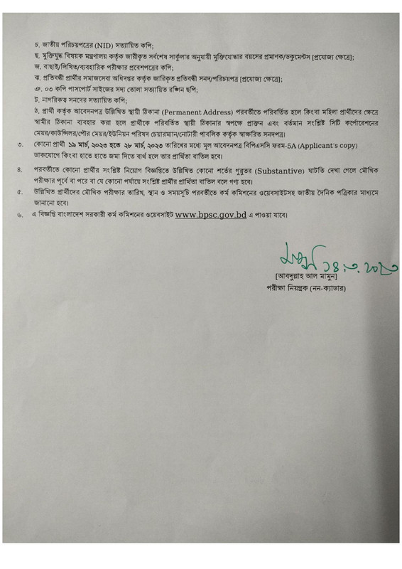 ৩. কোনো প্রার্থী ১৯ মার্চ, ২০২৩ হতে ২৮ মার্চ, ২০২৩ তারিখের মধ্যে মূল আবেদনপত্র বিপিএসসি ফরম- 5A (Applicant’s Copy) ডাকযোগে কিংবা হাতে হাতে জমা দিতে ব্যর্থ হলে তার প্রার্থিতা বাতিল হবে।