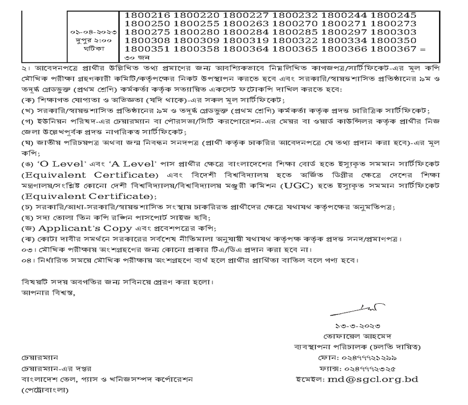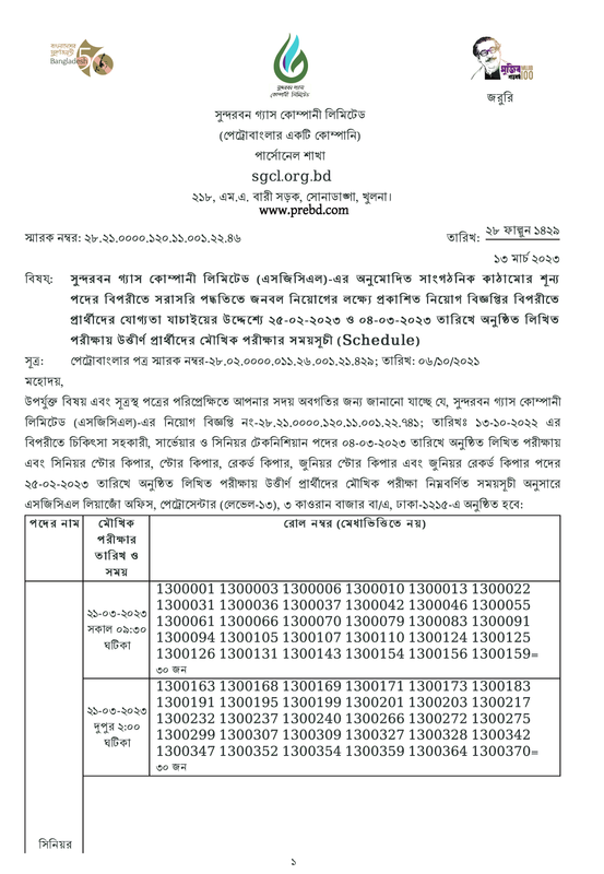 সুন্দরবন গ্যাস কোম্পানী লিমিটেড (এসজিসিএল)-এর শূন্য পদের বিপরীতে সরাসরি পদ্ধতিতে জনবল নিয়োগের লক্ষ্যে প্রকাশিত নিয়োগ বিজ্ঞপ্তির বিপরীতে ২৫-০২-২০২৩ ও ০৪-০৩-২০২৩ তারিখে অনুষ্ঠিত লিখিত পরীক্ষায় উত্তীর্ণ প্রার্থীদের মৌখিক পরীক্ষার সময়সূচী। পেট্রোবাংলার পত্র স্মারক তারিখ: 06/10/2021 উপর্যুক্ত বিষয় এবং সূত্রস্থ পত্রের পরিপ্রেক্ষিতে আপনার সদয় অবগতির জন্য জানানো যাচ্ছে যে,
