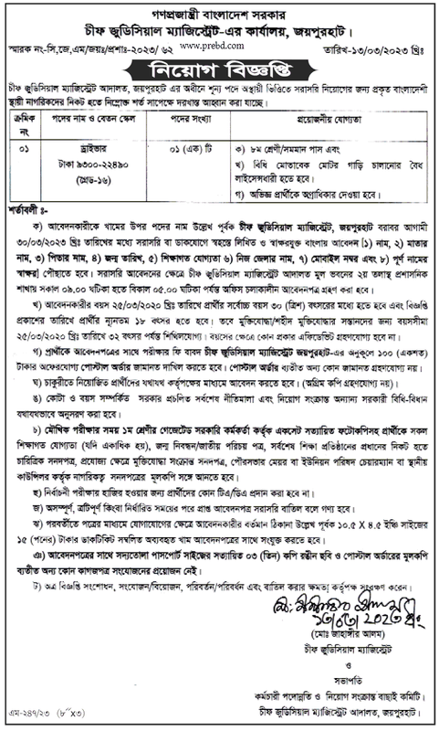জয়পুরহাট চীফ জুডিসিয়াল ম্যাজিস্ট্রেট কার্যালয় নিয়োগ বিজ্ঞপ্তি ২০২৩