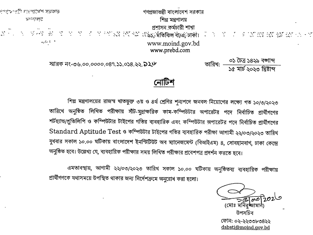 শিল্প মন্ত্রণালয় নিয়োগের ব্যবহারিক পরীক্ষার সময়সূচী ২০২৩
