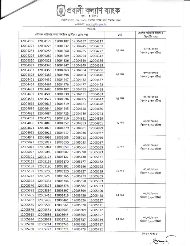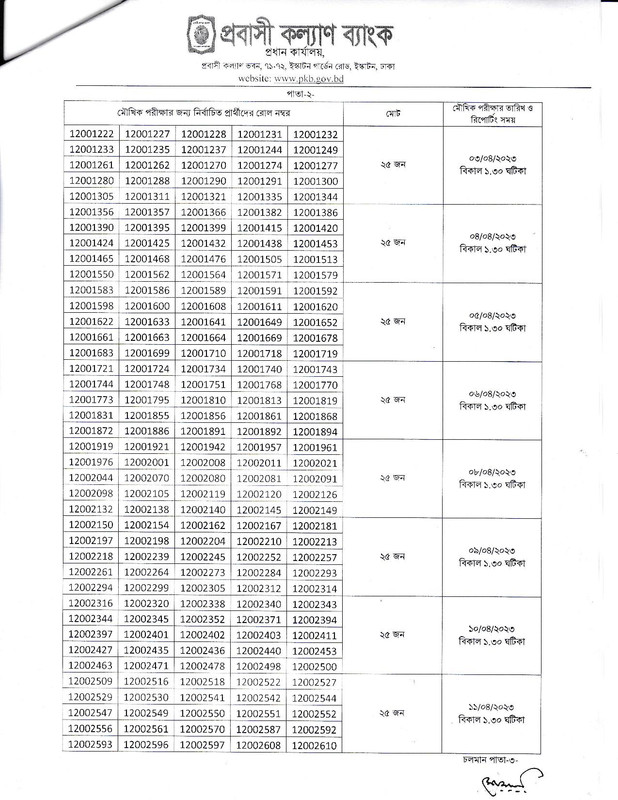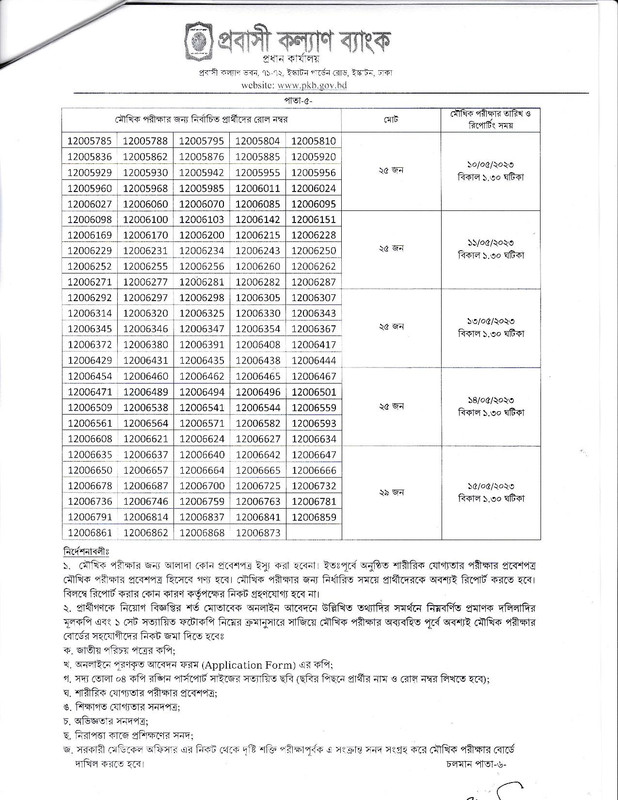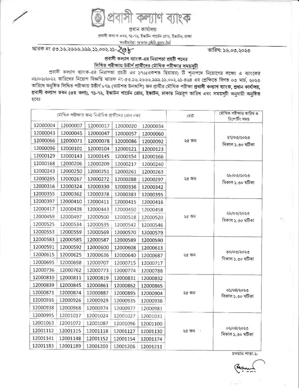 ০১/০৬/২০২২ তারিখের নিয়োগ বিজ্ঞপ্তি স্মারক নং- 53.16.2666.999.12.002.২১-৪৬৪ এর প্রেক্ষিতে বিগত ০৩ মার্চ, ২০২৩ তারিখে অনুষ্ঠিত লিখিত পরীক্ষায় উত্তীর্ণ ৮৭৯ (আটশত উনআশি) জন প্রার্থীর মৌখিক পরীক্ষা প্রবাসী কল্যাণ ব্যাংক, প্রধান কার্যালয়, প্রবাসী কল্যাণ ভবন (৩য় তলা), ৭১-৭২, ইস্কাটন গার্ডেন রোড, ইস্কাটন, ঢাকায় নিম্নরূপ তারিখ এবং সময়সূচী অনুযায়ী অনুষ্ঠিত হবে।