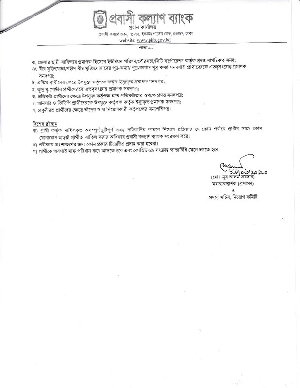 - ক) প্রার্থী কর্তৃক দাখিলকৃত অসম্পূর্ণ/ত্রুটিপূর্ণ তথ্য/ দলিলাদির কারণে নিয়োগ প্রক্রিয়ার যে কোন পর্যায়ে প্রার্থীর সাথে কোন যোগাযোগ ছাড়াই প্রার্থীতা বাতিল করার অধিকার প্রবাসী কল্যাণ ব্যাংক সংরক্ষণ করে।