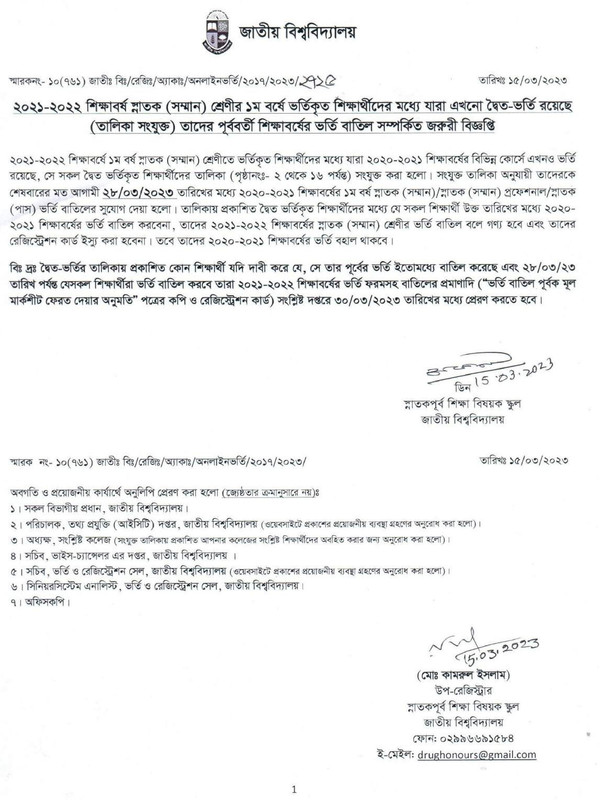 সংযুক্ত তালিকা অনুযায়ী তাদেরকে শেষবারের মত আগামী ২৮/০৩/২০২৩ তারিখের মধ্যে ২০২০-২০২১ শিক্ষাবর্ষের ১ম বর্ষ স্নাতক (সম্মান)/স্নাতক (সম্মান) প্রফেশনাল/স্নাতক (পাস) ভর্তি বাতিলের সুযোগ দেয়া হলো। তালিকায় প্রকাশিত দ্বৈত ভর্তিকৃত শিক্ষার্থীদের মধ্যে যে সকল শিক্ষার্থী উক্ত তারিখের মধ্যে ২০২০-২০২১ শিক্ষাবর্ষের ভর্তি বাতিল করবেনা, তাদের ২০২১-২০২২ শিক্ষাবর্ষের স্নাতক (সম্মান) শ্রেণীর ভর্তি বাতিল বলে গণ্য হবে এবং তাদের রেজিস্ট্রেশন কার্ড ইস্যু করা হবেনা। তবে তাদের ২০২০-২০২১ শিক্ষাবর্ষের ভর্তি বহাল থাকবে।