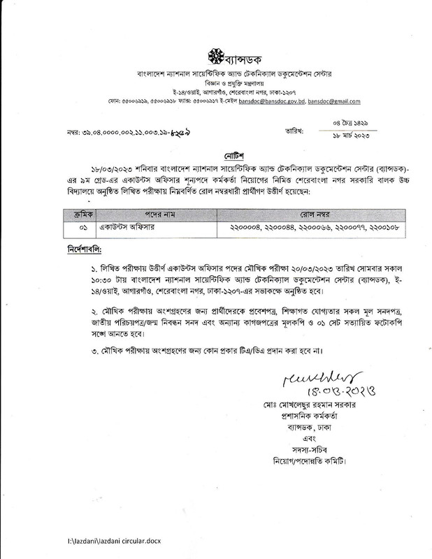 ১৮/০৩/২০২৩ শনিবার বাংলাদেশ ন্যাশনাল সায়েন্টিফিক অ্যান্ড টেকনিক্যাল ডকুমেন্টেশন সেন্টার (ব্যান্সডক)- এর ৯ম গ্রেড-এর একাউন্টস অফিসার শূন্যপদে কর্মকর্তা নিয়োগের নিমিত্ত শেরেবাংলা নগর সরকারি বালক উচ্চ বিদ্যালয়ে অনুষ্ঠিত লিখিত পরীক্ষায় নিম্নবর্ণিত রোল নম্বরধারী প্রার্থীগণ উত্তীর্ণ হয়েছেন।