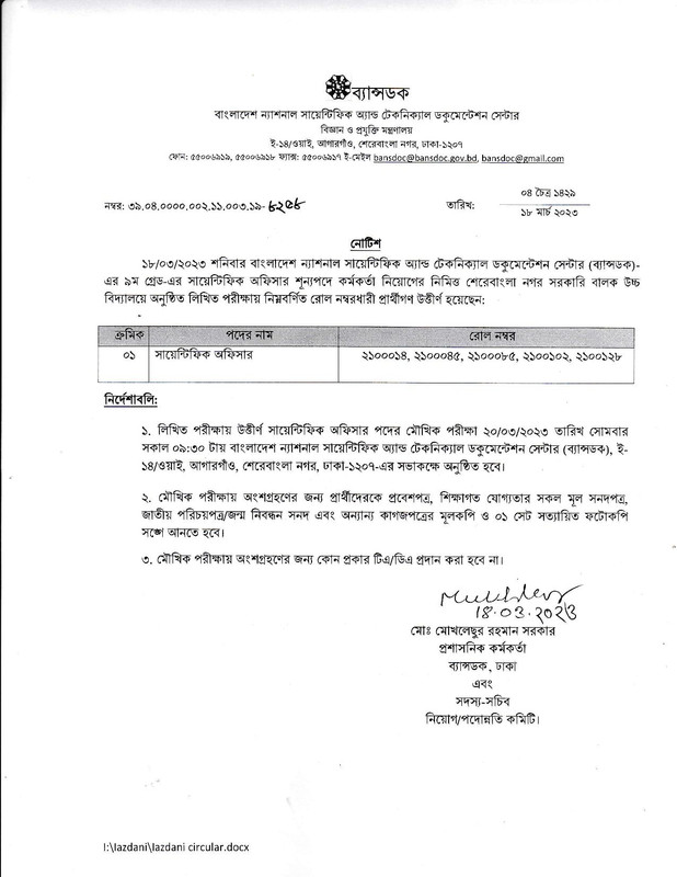১. লিখিত পরীক্ষায় উত্তীর্ণ সায়েন্টিফিক অফিসার পদের মৌখিক পরীক্ষা ২০/০৩/২০২৩ তারিখ সোমবার সকাল ০৯:৩০ টায় বাংলাদেশ ন্যাশনাল সায়েন্টিফিক অ্যান্ড টেকনিক্যাল ডকুমেন্টেশন সেন্টার (ব্যান্সডক), ই- ১৪/ওয়াই, আগারগাঁও, শেরেবাংলা নগর, ঢাকা-১২০৭-এর সভাকক্ষে অনুষ্ঠিত হবে।