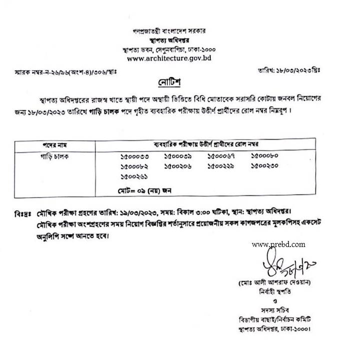 মৌখিক পরীক্ষা গ্রহণের তারিখ: ১৯/03/2023, সময়: বিকাল ৩:০০ ঘটিকা, স্থান: স্থাপত্য অধিদপ্তর। মৌখিক পরীক্ষা অংশগ্রহণের সময় নিয়োগ বিজ্ঞপ্তির শর্তানুসারে প্রয়োজনীয় সকল কাগজপত্রের মূলকপিসহ একসেট অনুলিপি সঙ্গে আনতে হবে।