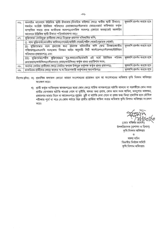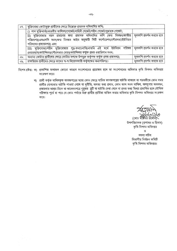 খ) প্রার্থী কর্তৃক দাখিলকৃত কাগজপত্রের মধ্যে কোন ক্ষেত্রে যাচিত কাগজপত্রের ঘাটতি থাকলে বা পরবর্তীতে কোন সময় প্রার্থীর যোগ্যতার ঘাটতি পাওয়া গেলে বা দুর্নীতি, অসত্য তথ্য প্রদান, কোন জাল সনদ দাখিল, অসদুপায় অবলম্বন, প্রতারণার আশ্রয় নিলে বা আবেদনপত্রে গুরুতর ত্রুটি বা ঘাটতি দেখা গেলে বা প্রদত্ত তথ্য মিথ্যা প্রমাণিত হলে মৌখিক পরীক্ষার পূর্বে বা পরে যে কোন পর্যায়ে উক্ত প্রার্থীর প্রার্থিতা বাতিল করার অধিকার কৃষি বিপণন অধিদপ্তর সংরক্ষণ করে।