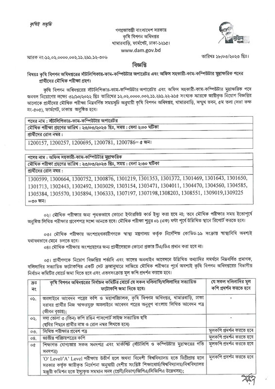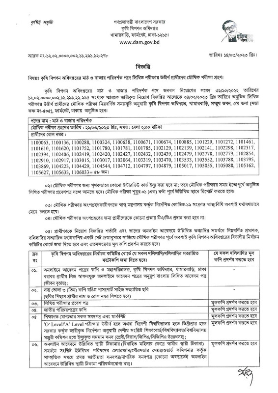 কৃষি বিপণন অধিদপ্তর মৌখিক পরীক্ষার সময়সূচি ২০২৩
