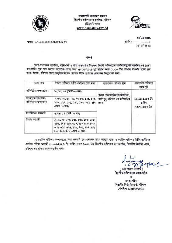 ব্যবহারিক পরীক্ষায় অংশগ্রহণের সময় অবশ্যই মূল প্রবেশপত্র সাথে আনতে হবে। ব্যবহারিক পরীক্ষায় উত্তীর্ণ প্রার্থীদের মৌখিক পরীক্ষা আগামী ২০-০৩-২০২৩ খ্রি. তারিখ সকাল ১০:০০ টায় বিভাগীয় কমিশনার ও সভাপতি, বিভাগীয় নির্বাচনী বোর্ড, বরিশাল-এর অফিস কক্ষে অনুষ্ঠিত হবে।