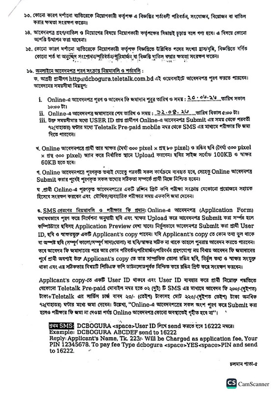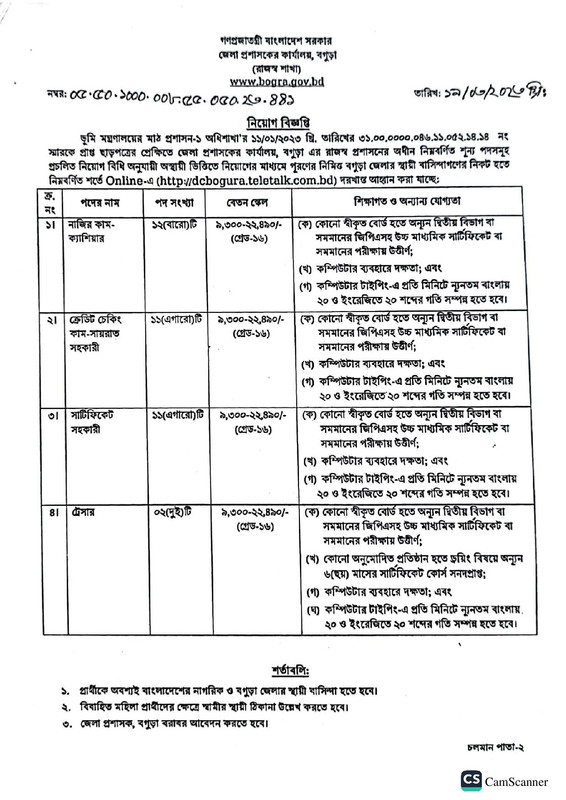 স্মারকে প্রাপ্ত ছাড়পত্রের প্রেক্ষিতে জেলা প্রশাসকের কার্যালয়, বগুড়া এর রাজস্ব প্রশাসনের অধীন নিম্নবর্ণিত শূন্য পদসমূহ প্রচলিত নিয়োগ বিধি অনুযায়ী অস্থায়ী ভিত্তিতে নিয়োগের মাধ্যমে পূরণের নিমিত্ত বগুড়া জেলার স্থায়ী বাসিন্দাগণের নিকট হতে নিম্নবর্ণিত শর্তে Online-এ (http://dcbogura.teletalk.com.bd) দরখাস্ত আহ্বান করা যাচ্ছে। প্রার্থীকে অবশ্যই বাংলাদেশের নাগরিক ও বগুড়া জেলার স্থায়ী বাসিন্দা হতে হবে। বিবাহিত মহিলা প্রার্থীদের ক্ষেত্রে স্বামীর স্থায়ী ঠিকানা উল্লেখ করতে হবে। জেলা প্রশাসক, বগুড়া বরাবর আবেদন করতে হবে।