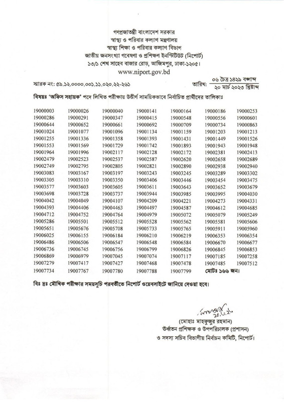 নিপোর্ট অফিস সহায়ক চাকরির পরীক্ষার ফলাফল ২০২৩। জাতীয় জনসংখ্যা গবেষণা ও প্রশিক্ষণ ইনস্টিটিউট (নিপোর্ট)। www.niport.gov.bd। ‘অফিস সহায়ক’ পদে লিখিত পরীক্ষায় উত্তীর্ণ সাময়িকভাবে নির্বাচিত প্রার্থীদের তালিকা প্রকাশ। নিপোর্ট অফিস সহায়ক নিয়োগ ফলাফল ২০২৩।