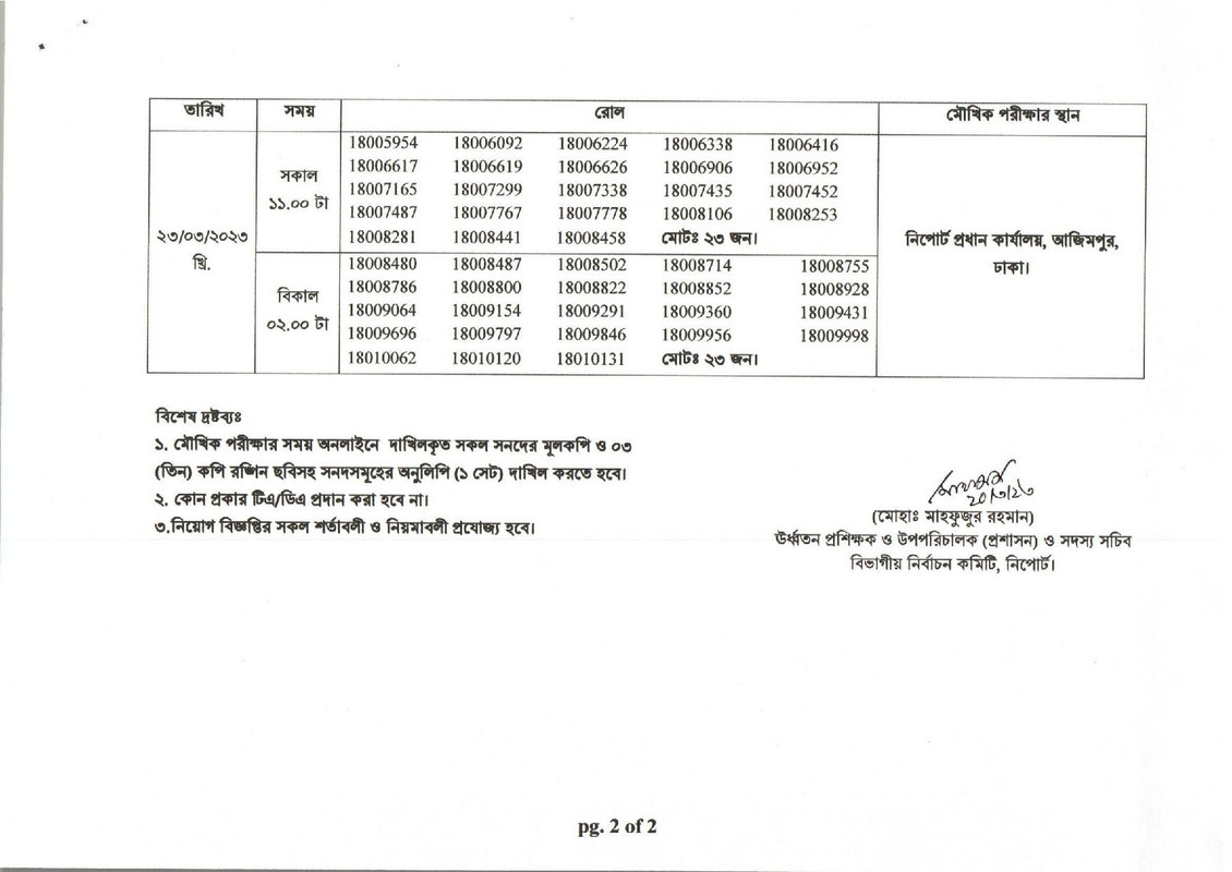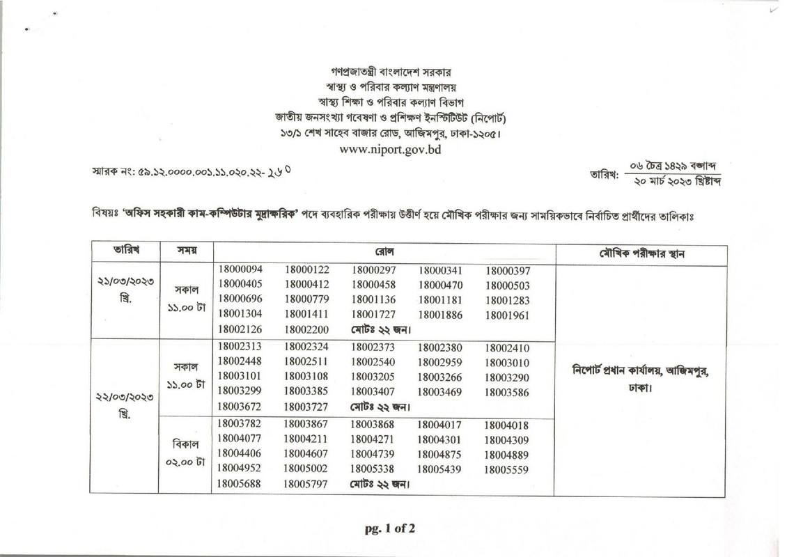 জাতীয় জনসংখ্যা গবেষণা ও প্রশিক্ষণ ইনস্টিটিউট (নিপোর্ট) অফিস সহকারী কাম-কম্পিউটার মুদ্রাক্ষরিক’ পদে ব্যবহারিক পরীক্ষায় উত্তীর্ণ হয়ে মৌখিক পরীক্ষার জন্য সাময়িকভাবে নির্বাচিত প্রার্থীদের তালিকা। মৌখিক পরীক্ষার সময় অনলাইনে দাখিলকৃত সকল সনদের মূলকপি ও ০৩ (তিন) কপি রঙিন ছবিসহ সনদসমূহের অনুলিপি (১ সেট) দাখিল করতে হবে। কোন প্রকার টিএ/ডিএ প্রদান করা হবে না । নিয়োগ বিজ্ঞপ্তির সকল শর্তাবলী ও নিয়মাবলী প্রযোজ্য হবে।