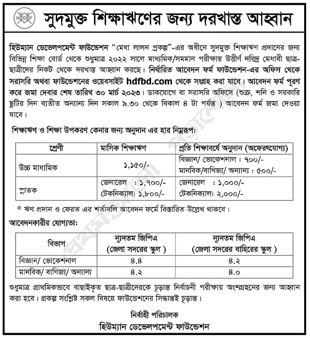 এইচএসসি ও স্নাতকের শিক্ষার্থীদের সুদমুক্ত শিক্ষাঋণের দরখাস্ত আহ্বান। হিউম্যান ডেভেলপমেন্ট ফাউন্ডেশন ‘মেধা লালন প্রকল্পের’ অধীনে শিক্ষার্থীদের সুদমুক্ত শিক্ষাঋণ প্রদান করবে। দেশের সব শিক্ষা বোর্ড থেকে শুধু ২০২২ সালে মাধ্যমিক/সমমান পরীক্ষায় উত্তীর্ণ দরিদ্র মেধাবী ছাত্রছাত্রীরা আবেদন করতে পারবে। আবেদন জমা দেয়ার শেষ সময় ৩০ মার্চ।