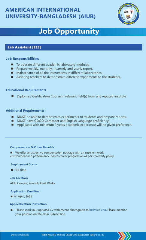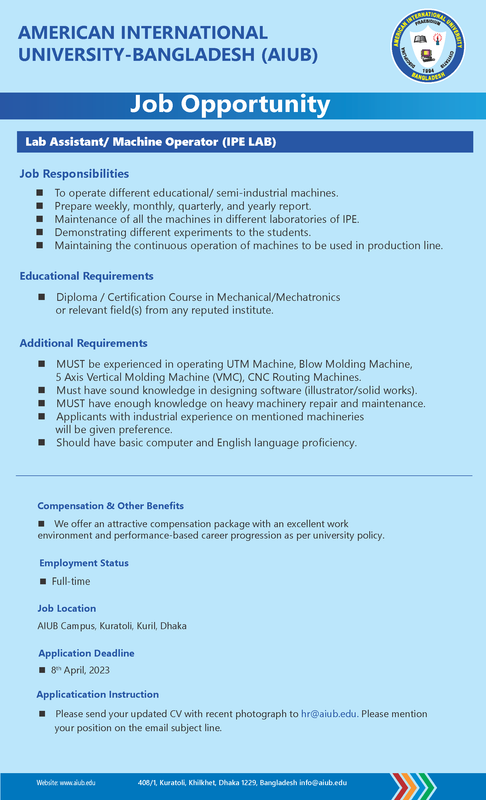 আমেরিকান ইন্টারন্যাশনাল ইউনিভার্সিটি বাংলাদেশ (AIUB) এ বিভিন্ন পদে নিয়োগ বিজ্ঞপ্তি। প্রফেসর, এসোসিয়েট প্রফেসর, এসিসট্যান্ট প্রফেসর, লেকচারার, ফায়ার প্রোটেকশন ইঞ্জিনিয়ার, ল্যাব অ্যাসিস্ট্যান্ট [ইইই], ল্যাব অ্যাসিস্ট্যান্ট/ মেশিন অপারেটর (আইপিই ল্যাব) পদের নিয়োগ বিজ্ঞপ্তি দেখুন। আমেরিকান ইন্টারন্যাশনাল ইউনিভার্সিটি-বাংলাদেশ (এআইইউবি) নিয়োগ বিজ্ঞপ্তি। আমেরিকান ইন্টারন্যাশনাল ইউনিভার্সিটি-বাংলাদেশ (এআইইউবি)’র ক্যাম্পাসে অবস্থিত নিজস্ব ডে কেয়ার সেন্টারে ১ (এক)-জন সুপারভাইজর এবং ২ (দুই) জন ন্যানি / আয়া নিয়োগ দেয়া হবে।