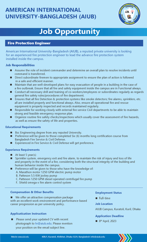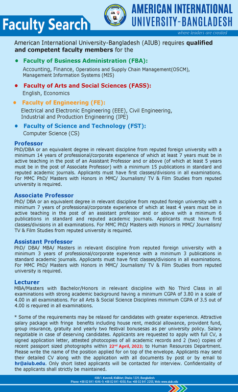 আগ্রহী প্রার্থী পূর্ণ জীবন বৃত্তান্ত, শিক্ষাগত যোগ্যতার সনদসমূহের ফটোকপি, ন্যাশনাল আইডি কার্ডের ফটোকপি, এবং ২ কপি পাসপোর্ট সাইজের ছবিসহ আগামী ২৭ এপ্রিল ২০২৩ তারিখের মধ্যে এআইইউবি ক্যাম্পাস (৪০৮/১, কুড়াতলি, খিলক্ষেত, ঢাকা ১২২৯) অফিসে জমা দিতে হবে। অথবা মেইল করতে হবে hr@aiub.edu এই ঠিকানায়। Website: www.aiub.edu