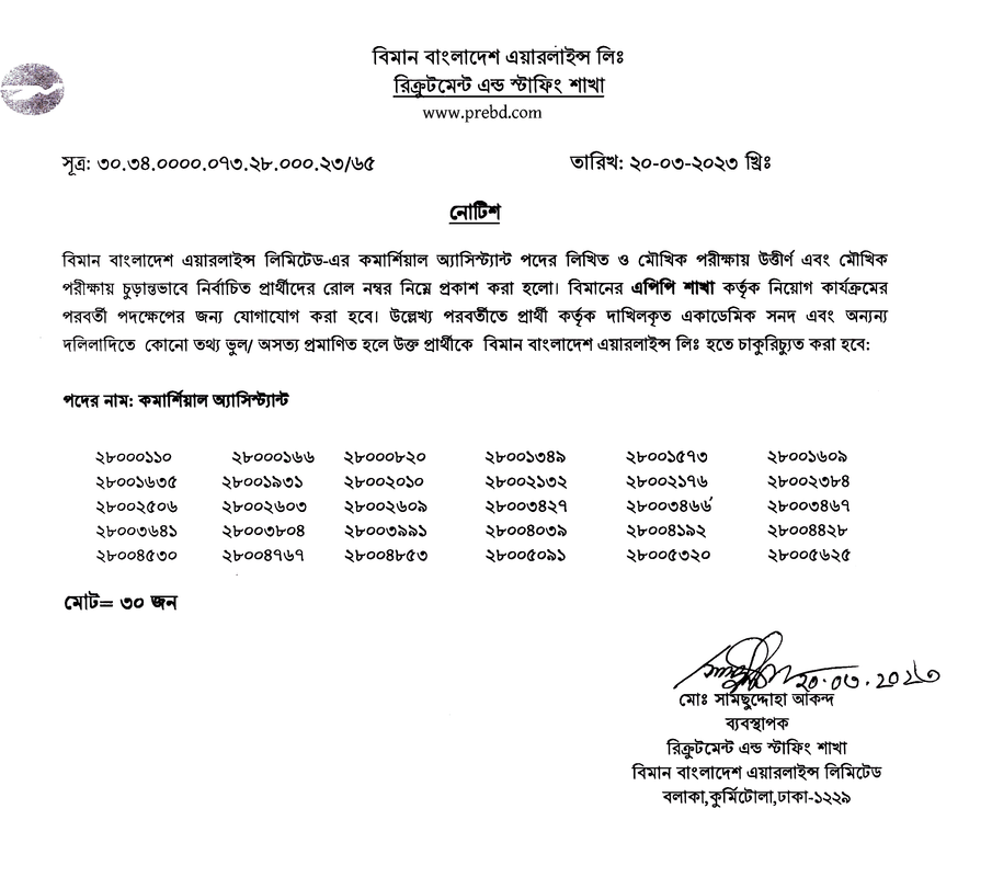 বিমান বাংলাদেশ এয়ারলাইন্স লিমিটেড-এর কমার্শিয়াল অ্যাসিস্ট্যান্ট পদের লিখিত ও মৌখিক পরীক্ষায় উত্তীর্ণ এবং মৌখিক পরীক্ষায় চুড়ান্তভাবে নির্বাচিত প্রার্থীদের রোল নম্বর নিম্নে প্রকাশ করা হলো। বিমানের এপিপি শাখা কর্তৃক নিয়োগ কার্যক্রমের পরবর্তী পদক্ষেপের জন্য যোগাযোগ করা হবে। উল্লেখ্য পরবর্তীতে প্রার্থী কর্তৃক দাখিলকৃত একাডেমিক সনদ এবং অন্যন্য দলিলাদিতে কোনো তথ্য ভুল/ অসত্য প্রমাণিত হলে উক্ত প্রার্থীকে বিমান বাংলাদেশ এয়ারলাইন্স লিঃ হতে চাকুরিচ্যুত করা হবে।
