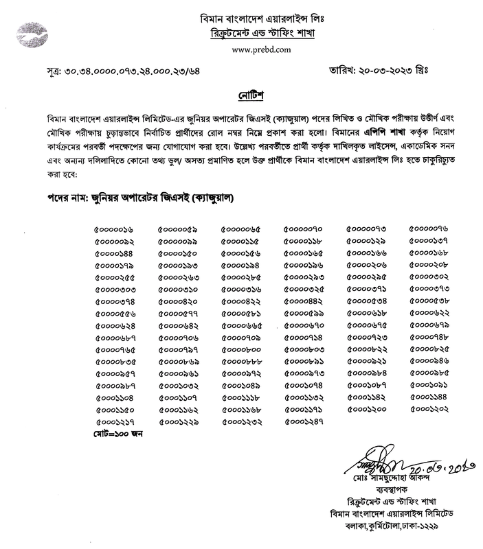 বিমান বাংলাদেশ এয়ারলাইন্স লিমিটেড-এর জুনিয়র অপারেটর জিএসই (ক্যাজুয়াল) পদের লিখিত ও মৌখিক পরীক্ষায় উত্তীর্ণ এবং মৌখিক পরীক্ষায় চুড়ান্তভাবে নির্বাচিত প্রার্থীদের রোল নম্বর নিম্নে প্রকাশ করা হলো। বিমানের এপিপি শাখা কর্তৃক নিয়োগ কার্যক্রমের পরবর্তী পদক্ষেপের জন্য যোগাযোগ করা হবে। উল্লেখ্য পরবর্তীতে প্রার্থী কর্তৃক দাখিলকৃত লাইসেন্স, একাডেমিক সনদ এবং অন্যন্য দলিলাদিতে কোনো তথ্য ভুল/ অসত্য প্রমাণিত হলে উক্ত প্রার্থীকে বিমান বাংলাদেশ এয়ারলাইন্স লিঃ হতে চাকুরিচ্যুত করা হবে।