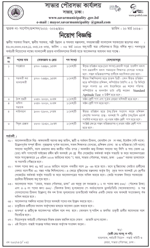 সাভার পৌরসভা কার্যালয় নিয়োগ বিজ্ঞপ্তি ২০২৩