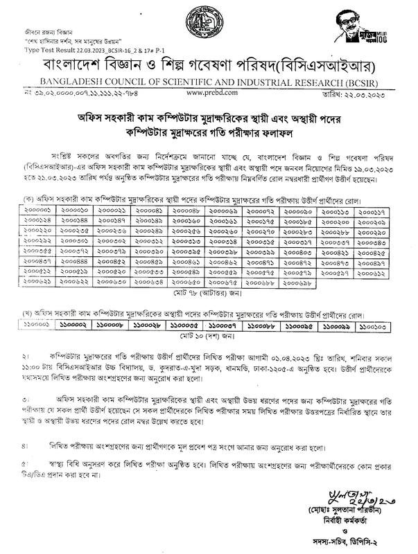 বাংলাদেশ বিজ্ঞান ও শিল্প গবেষণা পরিষদ (বিসিএসআইআর) এর কম্পিউটার মুদ্রাক্ষরের গতি পরীক্ষার ফলাফল। লিখিত পরীক্ষার তারিখঃ ১ এপ্রিল ২০২৩। ১৯.০৩.২০২৩ হতে ২১.০৩.২০২৩ তারিখ পর্যন্ত অনুষ্ঠিত কম্পিউটার মুদ্রাক্ষরের গতি পরীক্ষার ফলাফল। অফিস সহকারী কাম কম্পিউটার মুদ্রাক্ষরিকের স্থায়ী এবং অস্থায়ী পদের কম্পিউটার মুদ্রাক্ষরের গতি পরীক্ষার ফলাফল সংশ্লিষ্ট সকলের অবগতির জন্য নির্দেশক্রমে জানানো যাচ্ছে যে, বাংলাদেশ বিজ্ঞান ও শিল্প গবেষণা পরিষদ (বিসিএসআইআর)-এর অফিস সহকারী কাম কম্পিউটার মুদ্রাক্ষরিকের স্থায়ী এবং অস্থায়ী পদে জনবল নিয়োগের নিমিত্ত ১৯.০৩.২০২৩ হতে ২১.০৩.২০২৩ তারিখ পর্যন্ত অনুষ্ঠিত কম্পিউটার মুদ্রাক্ষরের গতি পরীক্ষায় নিম্নবর্ণিত রোল নম্বরধারী প্রার্থীগণ উত্তীর্ণ হয়েছেন।