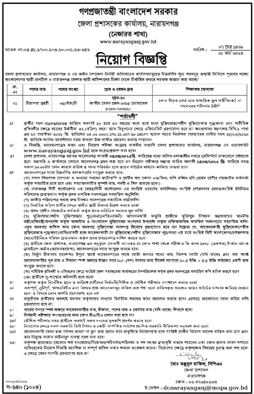 ৩. জেলা প্রশাসক, নারায়ণগঞ্জ বরাবর আবেদনপত্র আগামী ০৫/০৪/২০২৩খ্রি. তারিখের মধ্যে অফিস চলাকালীন সময়ে রেজিস্টার্ড ডাকযোগে পৌছাতে হবে। সরাসরি এ কার্যালয়ে কোনো আবেদনপত্র গ্রহণ করা হবে না। নিয়োগ পরীক্ষার সম্ভাব্য তারিখ আগামী ১৫/04/2023 খ্রি: তারিখে সময় সকাল ১০:০০টা। কোন কারণে তারিখ ও সময় পরিবর্তন হলে ওয়েব সাইটের মাধ্যমে জানিয়ে দেওয়া হবে।