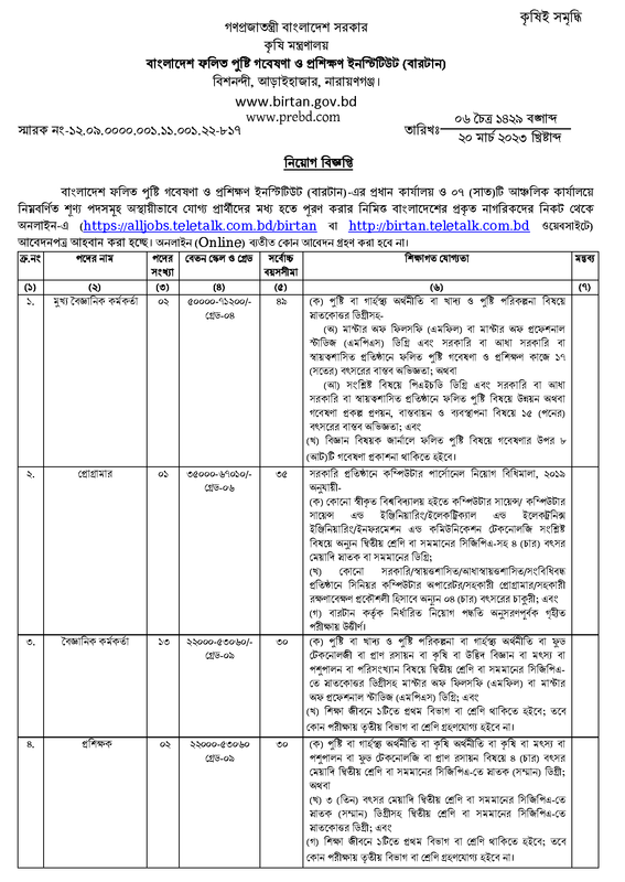 ৩৪ পদে বাংলাদেশ ফলিত পুষ্টি গবেষণা ও প্রশিক্ষণ ইনস্টিটিউট (বারটান) এ নিয়োগ বিজ্ঞপ্তি। বাংলাদেশ ফলিত পুষ্টি গবেষণা ও প্রশিক্ষণ ইনস্টিটিউট (বারটান)-এর অধীনস্থ রাজস্বখাতভুক্ত নিম্নবর্ণিত ০৯ (নয়) টি ক্যাটাগরির মোট ৩৪টি (চৌত্রিশ)টি শূন্য পদে জনবল নিয়োগের নিমিত্ত বিজ্ঞপ্তিতে বর্ণিত নিয়মাবলী ও শর্ত সাপেক্ষে বাংলাদেশের প্রকৃত স্থায়ী নাগরিকদের নিকট হতে অনলাইনে (http://birtan.teletalk.com.bd) ওয়েবসাইটে আবেদনপত্র আহবান করা যাচ্ছে। বিজ্ঞপ্তিটি পত্রিকা ছাড়াও বারটোন ওয়েবসাইট www.birtan.gov.bd এ বিজ্ঞপ্তিসহ সকল তথ্য দেখা যাবে। QR Code স্ক্যান এর মাধ্যমে টেলিটকের জবপোর্টাল ওয়েবসাইটে সরাসরি প্রবেশ করেও বিজ্ঞপ্তিটি পাওয়া যাবে। নিয়োগ পরীক্ষার তারিখ, সময় ও অন্যান্য তথ্য www.birtan.gov.bd ওয়েবসাইট হতে জানা যাবে।