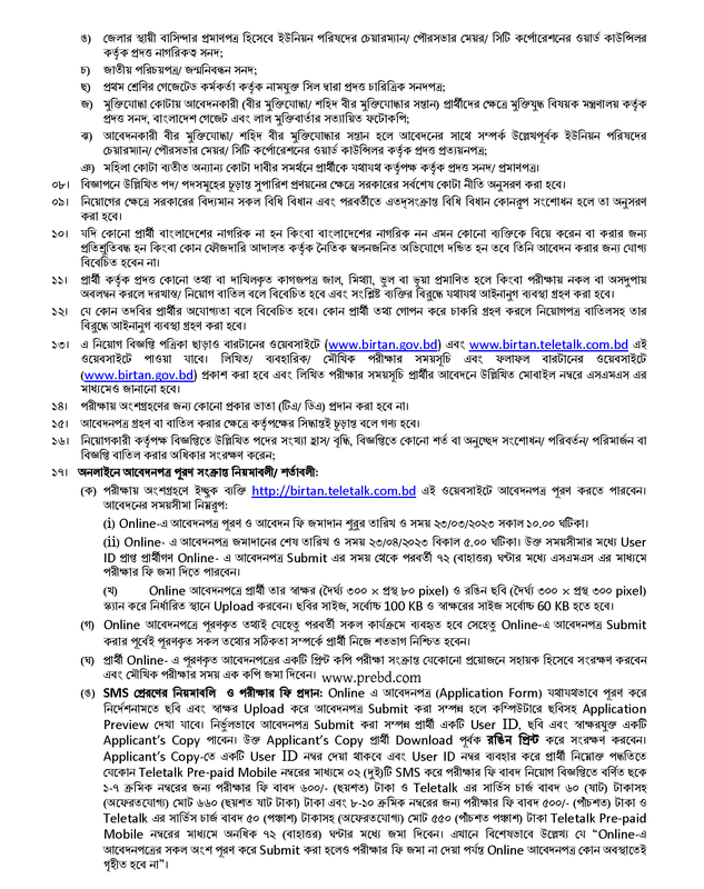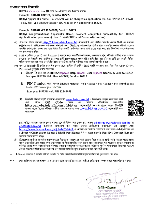 পরীক্ষায় অংশগ্রহণে আগ্রহী প্রার্থীগণ-কে http://birtan.teletalk.com.bd এই ওয়েবসাইটে আবেদনপত্র পূরণ করতে হবে। অনলাইনে আবেদনপত্র পূরণ পরীক্ষা ফি জমাদান শুরুর তারিখ ও সময় ১৪ ফেব্রুয়ারি, ২০২৪ খ্রি: সকাল ০৯:০০ টায়। অনলাইনে আবেদনপত্র জমাদানের শেষ তারিখ ও সময় ২৯ ফেব্রুয়ারি, ২০২৪ খ্রি: সন্ধা ০৬:০০ টা পর্যন্ত। উক্ত সময়সীমার মধ্যে বর্ণিত ওয়েবসাইটে User ID প্রাপ্ত প্রার্থীগণ অনলাইনে আবেদনপত্র submit এর সময় থেকে পরবর্তী ৭২ (বাহাত্তর) ঘন্টার মধ্যে এসএমএস (SMS) এ পরীক্ষার ফি জমা দিতে হবে।