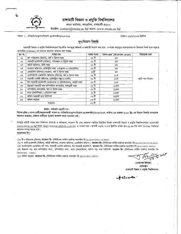 রাঙ্গামাটি বিজ্ঞান ও প্রযুক্তি বিশ্ববিদ্যালয়ের নিম্নবর্ণিত পদসমূহে কর্মকর্তা ও কর্মচারী নিয়োগ করা হবে। এ লক্ষ্যে জন্যসূত্রে বাংলাদেশের নাগরিকদের নিকট হতে শুধুমাত্র অনলাইনে (Online) এর মাধ্যমে আবেদন আহবান করা যাচ্ছে। যেসব প্রার্থী/আবেদনকারী স্মারক নং- রবিবধি/সংস্থাপন নিয়োগ-ও (অনলাইন)/ ২০২০/২০৪, তারিখঃ ২০ নভেম্বর ২০২০ খ্রিঃ এর নিয়োগ বিজ্ঞপ্তি মোতাবেক আবেদন করেছেন, সেইসব প্রার্থীদের পুনরায় আবেদন করার প্রয়োজন নেই।