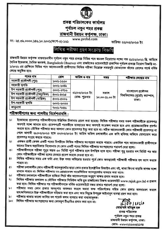 রাজধানী উন্নয়ন কর্তৃপক্ষ (রাজউক) এর পূর্বাচল নতুন শহর প্রকল্পে জনবল নিয়োগের লিখিত পরীক্ষা গ্রহন সংক্রান্ত বিজ্ঞপ্তি প্রকাশ। রাজধানী উন্নয়ন কর্তৃপক্ষ বাস্তবায়নাধীন পূর্বাচল নতুন শহর প্রকল্পে বিভিন্ন পদে জনবল নিয়োগের লক্ষ্যে গত ২১/১২/২০২২ খ্রি. তারিখে দৈনিক ইত্তেফাক, দৈনিক জনকন্ঠ, Bangladesh Observer এবং রাজউকের ওয়েবসাইটে প্রকাশিত পূর্বাচল প্রকল্পে নিয়োগ বিজ্ঞপ্তি নং- ১/২০২২ এর প্রেক্ষিতে বিভিন্ন পদে আবেদনকারী প্রার্থীগণের লিখিত পরীক্ষা নিম্নোক্ত সময়সূচি মোতাবেক তাঁদের রোলের পার্শ্বে বর্ণিত কেন্দ্রে অনুষ্ঠিত হবে।