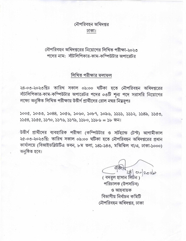 নৌপরিবহন অধিদপ্তরের নিয়োগের লিখিত পরীক্ষা-২০২৩। পদের নাম: সাঁটলিপিকার-কাম-কম্পিউটার অপারেটর লিখিত পরীক্ষার ফলাফল। ২৪-০৩-২০২৩খ্রিঃ তারিখ সকাল ০৯:০০ ঘটিকা হতে নৌপরিবহন অধিদপ্তরের সাঁটলিপিকার-কাম-কম্পিউটার অপারেটর পদের ০৩টি শূন্য পদে সরাসরি নিয়োগের লক্ষ্যে অনুষ্ঠিত লিখিত পরীক্ষায় উত্তীর্ণ প্রার্থীদের রোল নম্বর নিম্নরূপ।