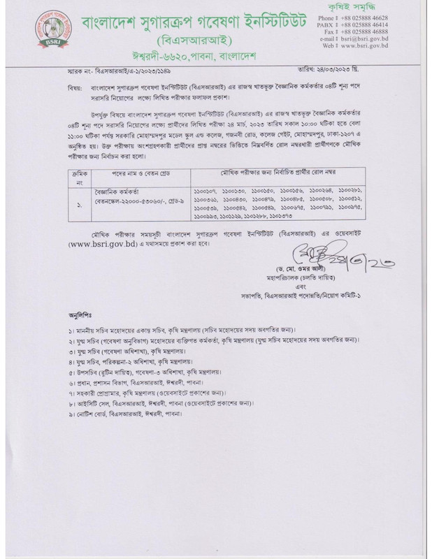 মৌখিক পরীক্ষার সময়সূচী বাংলাদেশ সুগারক্রপ গবেষণা ইনস্টিটিউট (বিএসআরআই) এর ওয়েবসাইট (www.bsri.gov.bd) এ যথাসময়ে প্রকাশ করা হবে।
