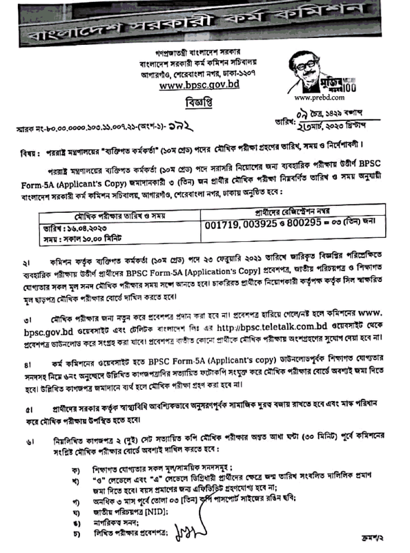 পররাষ্ট্র মন্ত্রণালয়ের ব্যক্তিগত কর্মকর্তা পদের মৌখিক পরীক্ষা সময়সূচি ২০২৩