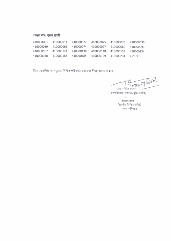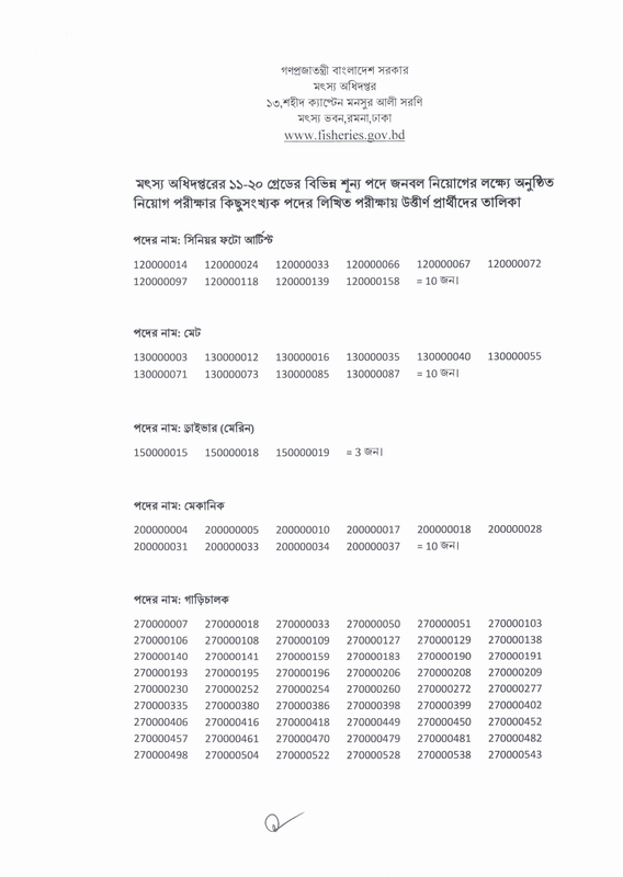 মৎস্য অধিদপ্তরের রাজস্বখাতে নক্সাকার, বাবুর্চি, ল্যাবরেটরি অ্যাটেনডেন্ট, সেকেন্ড ড্রাইভার, তথ্য সংগ্রহ সহকারী, কার চালক, পাম্প অপারেটর ও সুইপার-কাম-লস্কর পদে নিয়োগের লক্ষ্যে ২২/১২/২০২৩ ও ২৩/১২/২০২৩ তারিখ লিখিত পরীক্ষা অনুষ্ঠিত হয়। লিখিত পরীক্ষায় উত্তীর্ণ নিম্নবর্ণিত প্রার্থীদের ব্যবহারিক (প্রযোজ্য ক্ষেত্রে) ও মৌখিক পরীক্ষায় অংশগ্রহণের জন্য নির্বাচিত করা হলো। লিখিত পরীক্ষায় উত্তীর্ণ পরীক্ষার্থীদের ব্যবহারিক (প্রযোজ্য ক্ষেত্রে) ও মৌখিক পরীক্ষার তারিখ ও সময় পরবর্তীতে প্রকাশ করা হবে।