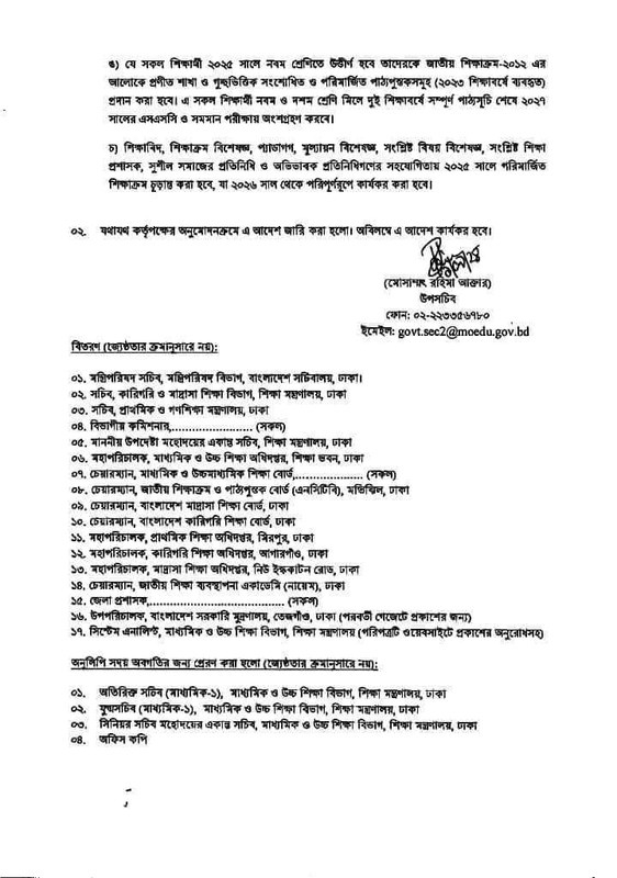 ঘ) ২০২৫ সালে দশম শ্রেণিতে উত্তীর্ণ শিক্ষার্থীদের এসএসসি ও সমমানের পরীক্ষা (২০২৬ সালের অনুষ্ঠিতব্য পরীক্ষা) নেয়ার লক্ষ্যে বিজ্ঞান, মানবিক ও ব্যবসায় শিক্ষা শাখা অব্যাহত রেখে পূর্বের জাতীয় শিক্ষাক্রম-২০১২ এর আলোকে প্রণীত সংশোধিত ও পরিমার্জিত পাঠ্যপুস্তকসমূহ (অর্থাৎ ২০২৩ শিক্ষাবর্ষে ব্যবহৃত পুস্তক) শিক্ষার্থীদের সরবরাহ করা হবে। জাতীয় শিক্ষাক্রম-২০১২ অনুসারে প্রণীত শাখা-বিজ্ঞান, মানবিক ও ব্যবসায় শিক্ষা ভিত্তিক এই পাঠ্যপুস্তকসমূহের একটি সংক্ষিপ্ত পাঠ্যসূচি প্রণয়ন করা হবে যাতে শিক্ষার্থীরা এক শিক্ষাবর্ষের মধ্যেই পাঠ্যসূচিটি সম্পন্ন করতে পারে। পাঠদান ও মূল্যায়ন পদ্ধতি জাতীয় শিক্ষাক্রম-২০১২ অনুসারে পরিচালিত হবে।