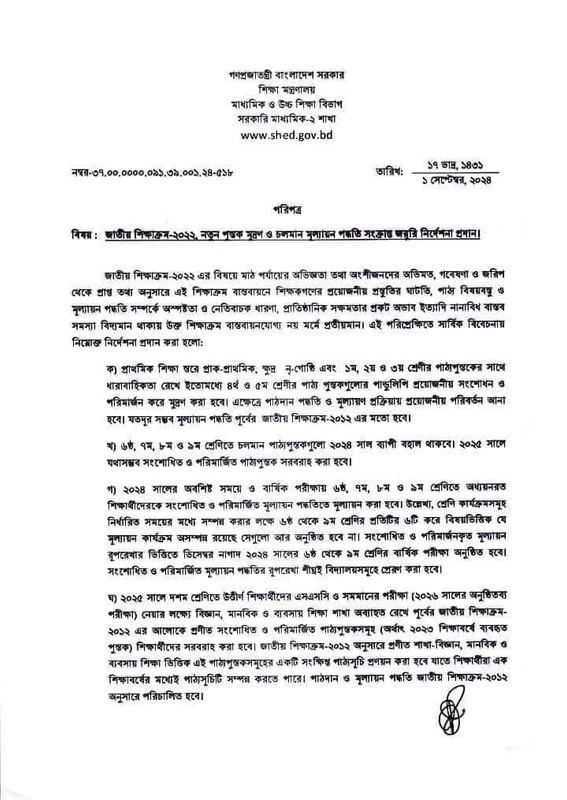 জাতীয় শিক্ষাক্রম- ২০২২, নতুন পুস্তক মুদ্রণ ও চলমান মূল্যায়ন পদ্ধতি সংক্রান্ত জরুরি নির্দেশনা প্রদান। জাতীয় শিক্ষাক্রম-২০১২ এর বিষয়ে মাঠ পর্যায়ের অভিজ্ঞতা তথা অংশীজনদের অভিমত, গবেষণা ও জরিপ থেকে প্রাপ্ত তথ্য অনুসারে এই শিক্ষাক্রম বাস্তবায়নে শিক্ষকগণের প্রয়োজনীয় প্রস্তুতির ঘাটভি, পাঠ্য বিষয়বস্তু ও মূল্যায়ন পদ্ধতি সম্পর্কে অস্পষ্টতা ও নেতিবাচক ধারণা, প্রাতিষ্ঠানিক সক্ষমতার প্রকট অভাব ইত্যাদি নানাবিধ বাস্তব সমস্যা বিদ্যমান থাকায় উক্ত শিক্ষাক্রম বাস্তবায়নযোগ্য নয় মর্মে প্রতীয়মান। এই পরিপ্রেক্ষিতে সার্বিক বিবেচনায় নিম্নোক্ত নির্দেশনা প্রদান করা হলো।