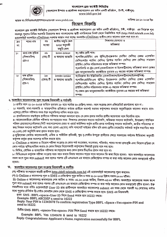 অনলাইনে আবেদনপত্র পূরণ সংক্রান্ত নিয়মাবলী ও করণীয়: পরীক্ষায় অংশগ্রহণে আগ্রহী প্রার্থীগণ http://bbfl.teletalk.com.bd এই ওয়েবসাইটে আবেদনপত্র পূরণ করবেন। Online-এ আবেদনপত্র পূরণ ও SMS এ রেজিস্ট্রেশন শুরুর তারিখ ও সময় ২১-১০-২০২৪ খ্রিষ্টাব্দ সকাল-১০:০০ ঘটিকা। Online-এ আবেদনপত্র জমাদানের শেষ তারিখ ও সময়: ৩১.১০.২০২৪ তারিখ, বিকাল ০৫:০০ ঘটিকা। অনলাইনে আবেদনের সকল অংশ পূরণ করে submit করা হলেও পরপর ২টি এসএমএস এর মাধ্যমে রেজিস্ট্রেশন সম্পন্ন না করা পর্যন্ত আবেদন কোন অবস্থাতেই গৃহীত হবেনা। উক্ত সময়সীমার মধ্যে বর্ণিত ওয়েবসাইটে User ID প্রাপ্ত প্রার্থীগণকে অনলাইনে আবেদনপত্র submit এর সময় থেকে পরবর্তী ৭২ (বাহাত্তর) ঘন্টার মধ্যে শুধুমাত্র টেলিটক প্রি-পেইড মোবাইল ফোন থেকে SMS এ রেজিস্ট্রেশন সম্পন্ন করতে হবে।
