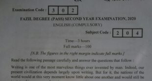 FAZIL DEGREE (PASS) SECOND YEAR EXAMINATION, 2020 ENGLISH (COMPULSORY) Subject Code : 204 Time-3 hours Full marks-100 Read the following passage carefully and answer the questions that follow: Writing is one of the most marvelous things ever invented by man. Indeed, our present civilization depends largely upon writing. But …