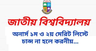জাতীয় বিশ্ববিদ্যালয়ে ১ম ও ২য় মেরিটে চান্স না পেলে করনীয় : যারা ১ম ও ২য় মেরিটেও চান্স পান নি, তারা অক্টোবর মাস পযর্ন্ত অপেক্ষা করুন। অক্টোবর মাসের ৫/১৫ তারিখের মধ্যে “১ম রিলিজ স্লিপে” ৫টা কলেজ নতুন করে সাবজেক্ট চয়েস দিয়ে আবেদন করতে পারবেন। যারা ১ম/২য় মেরিটে চান্স পেয়েও ভর্তি …